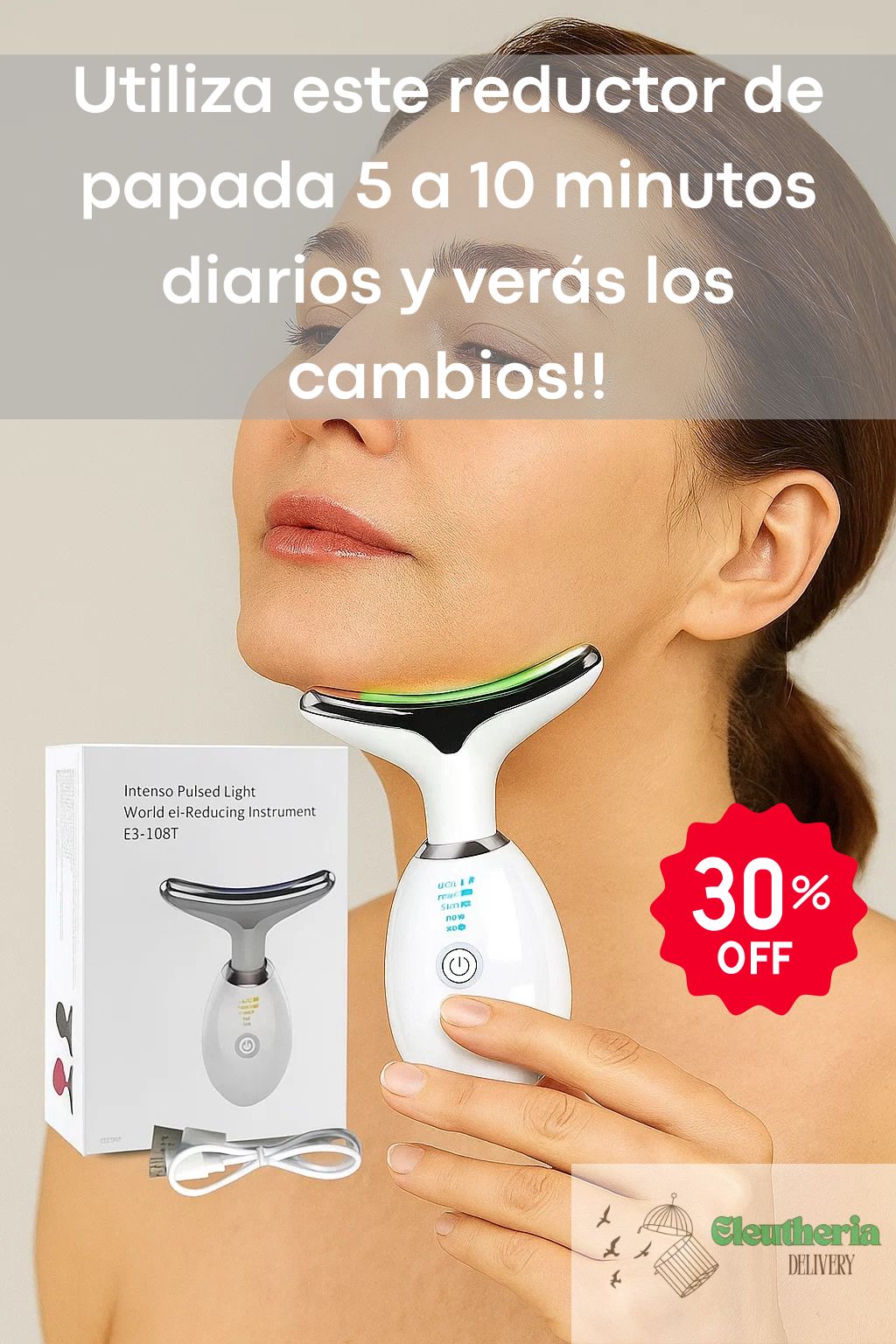 Di adiós a la flacidez y redefine tu contorno facial con el Masajeador Reductor de Papada E3-108T, un innovador dispositivo de belleza con tecnología de luz LED, calor y microvibraciones EMS. Su diseño ergonómico en forma de “Y” se adapta perfectamente a la línea del cuello y mandíbula, estimulando la piel y los músculos faciales para lograr un efecto reafirmante y rejuvenecedor.